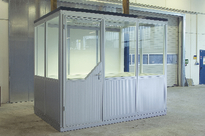 - eenvoudig te installeren prefab constructie van dak, wand en vloer - beoordeelde gebouwgeluidsisolatiewaarde R'w 28 dB (standaard), volgens testrapport nr. A4096, volgens DIN EN ISO 140-5 (objectgerelateerde afwijkingen mogelijk) - moderne oppervlakteprofilering in afwerkingsoptiek - wand- en dakconstructie van sandwichpanelen met bovenplaten van verzinkte, gecoate staalplaten met PU-schuimvulling (60 mm), Vlakke glasvullingen 6 mm - Deurelementen in geveldesign/optiek - Wandelementen statisch ontworpen voor latere uitbreiding, standaard dak, stofvrij, geïsoleerd (60 mm), beloopbaar met 1 kN (manbelasting) - 2 verdiepingen of op staalconstructieplatform met trappensysteem - 1-, 2- of 3-zijdige uitvoering - Ruimtehoogte tot 4 m mogelijk Type 0010-0030 - elementaire versie, 3-zijdig, op dragende bestaande wand - bestaande uit: Dak, massieve wand- en glaselementen en enkeldeurselementen - Kleur extern: wit aluminium RAL 9006 Interieur: zuiver wit RAL 9010 - Andere kleuren op aanvraag |
